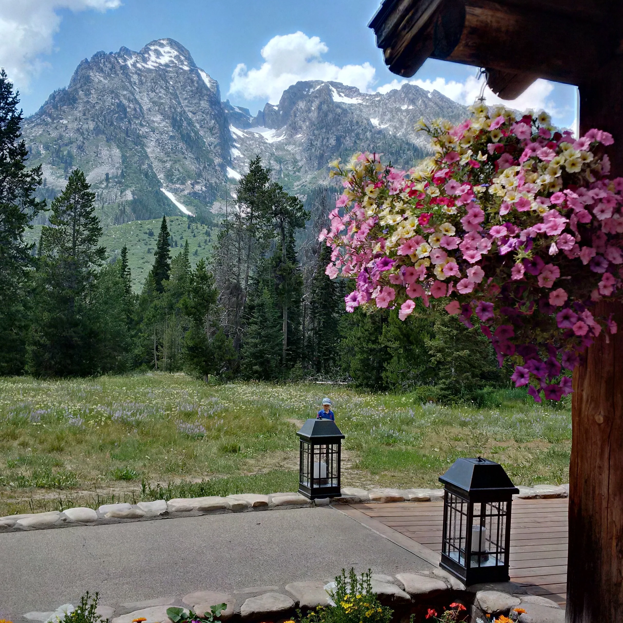 A portion of the Grand Teton Mountains from the porch of the main building at Jenny Lake Lodge, Jackson Hole, Wyoming